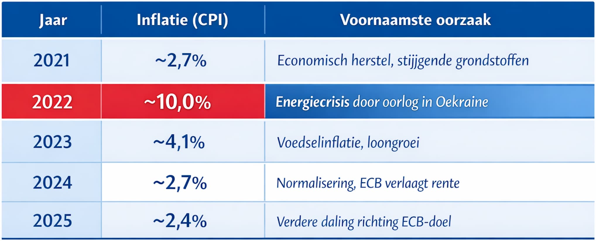 Hieronder zie je een overzicht van de jaarlijkse inflatie in Nederland over de afgelopen vijf jaar, met de belangrijkste oorzaak per jaar.